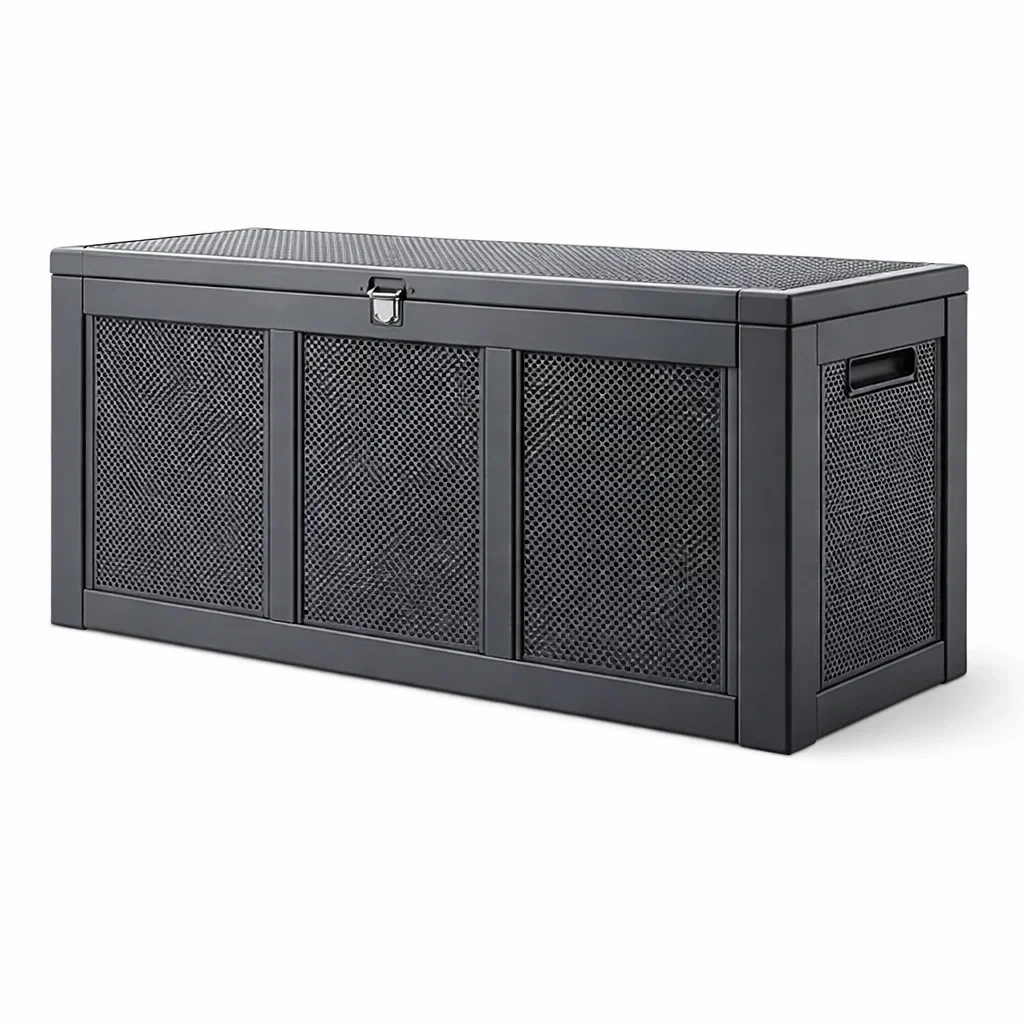 Ce coffre de rangement en métal perforé offre une capacité de 300 L. Sa structure robuste est idéale pour une utilisation en extérieur. Dimensions : 150 cm de longueur, 50 cm de largeur, 60 cm de hauteur. Poids net : 8.5 kg.