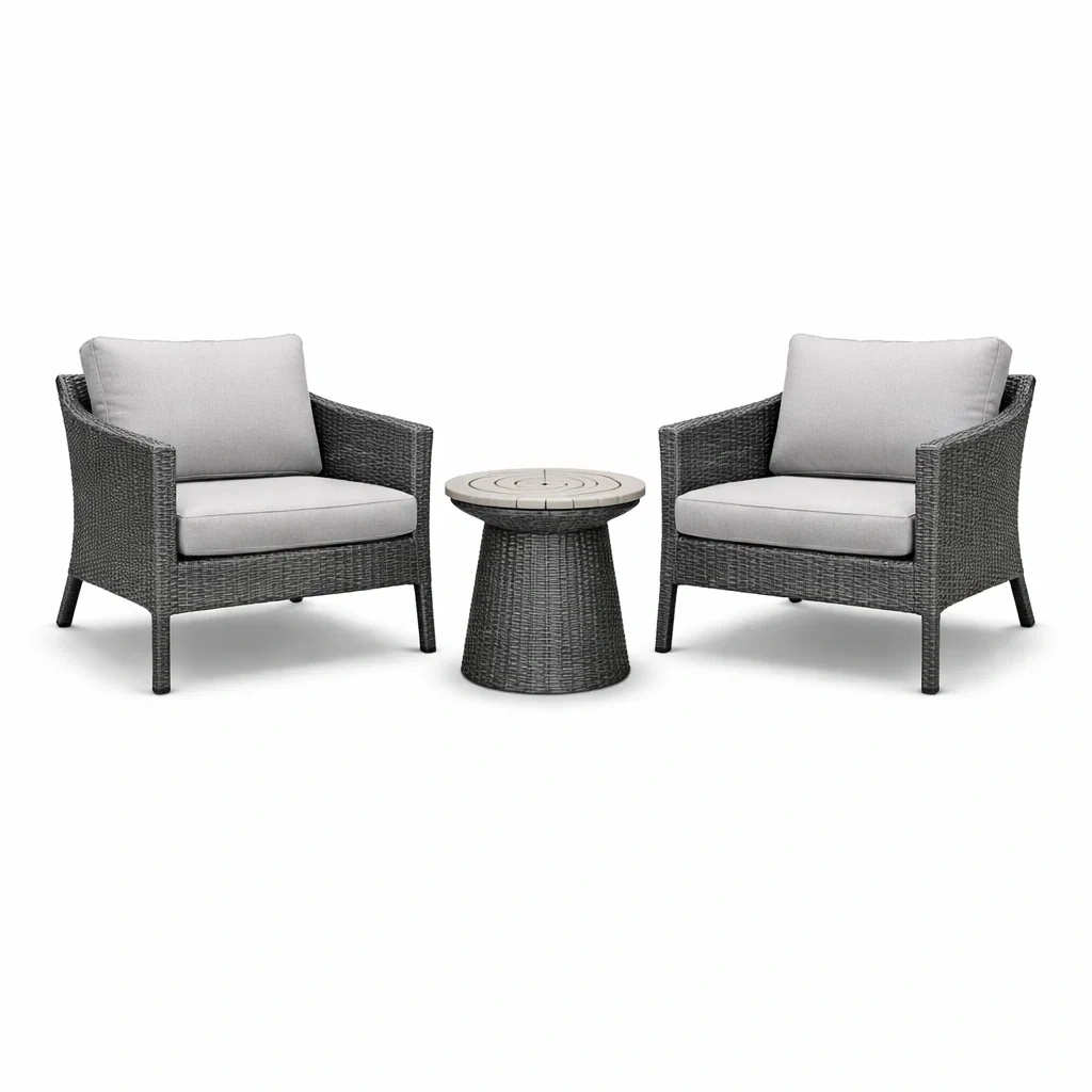 Ensemble comprenant deux fauteuils et une table. Les fauteuils sont fabriqués en résine tressée avec une structure en aluminium, et les coussins sont en polyester avec un remplissage en mousse. La table possède un plateau en bois composite.