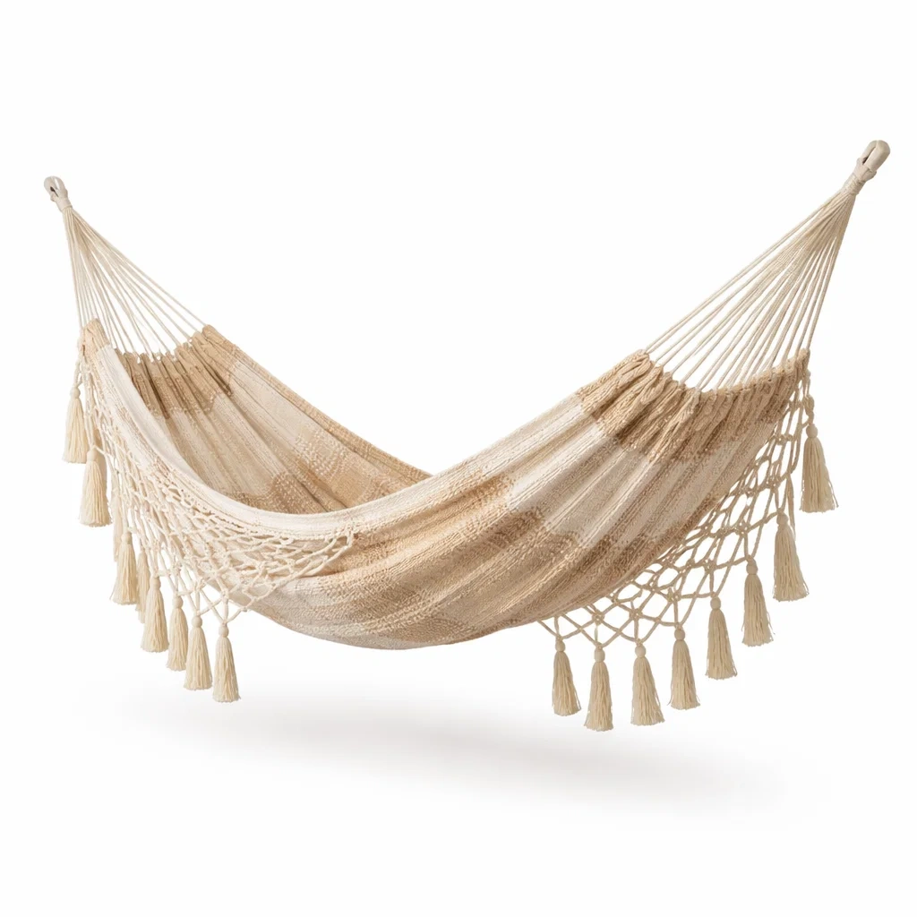 Ce hamac est fabriqué en coton naturel avec des franges décoratives. Sa longueur est de 200 cm et sa largeur de 150 cm.